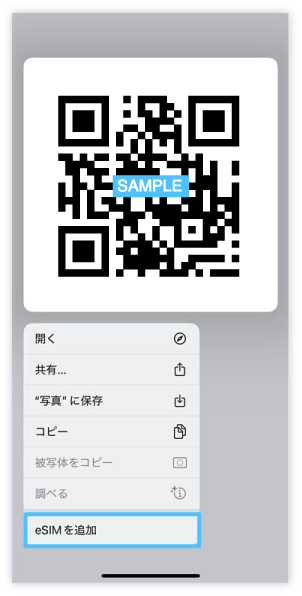 メールに添付されたQRコードを長押し➡【eSIMを追加】を選択 または、QRコードを印刷しカメラで読み取る
