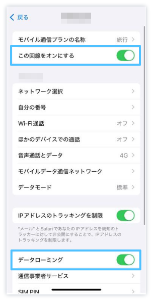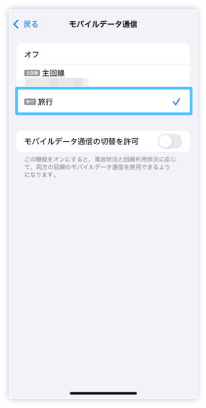 海外現地での高額請求を防ぐため、主回線(+81から始まる日本の携帯電話番号)のオフ設定