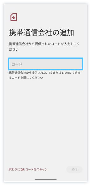 【設定】➡【ネットワークとインターネット】➡【SIM】➡【SIMの追加】➡【eSIMを設定】➡【こちらの解決方法をお試しください】➡【手動で入力】➡メールに記載されたアクティベーションコードを入力