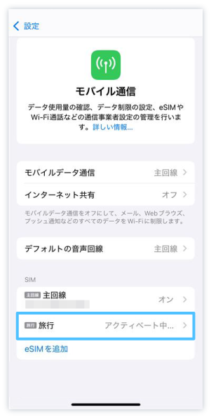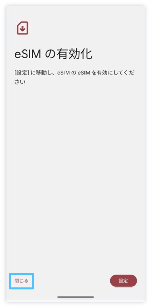 ※日本では海外現地回線に接続ができないため、アクティベート中の表記となります。 また、一定時間経過すると「eSIMをアクティベートできません」の表示がでますが、 eSIMの追加は完了していますのでご安心ください。