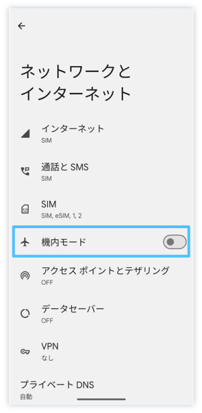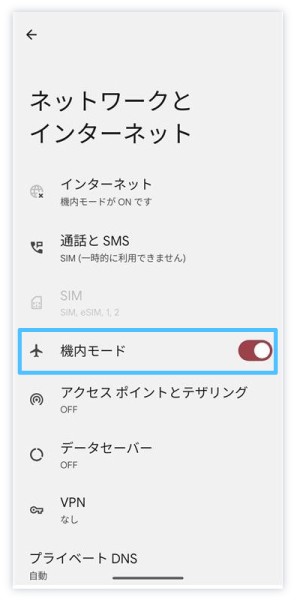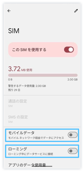 【設定】➡【ネットワークとインターネット】➡【SIM】➡【主回線のSIM】を選択➡【ローミングオフ】と【モバイルデータオフ】