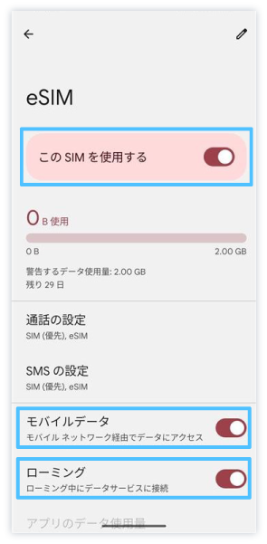 ※主回線を使った国際電話とショートメール不要の場合、【この回線をオンにするをオフ】にすることで下記のモバイルデータ通信もオフになります。