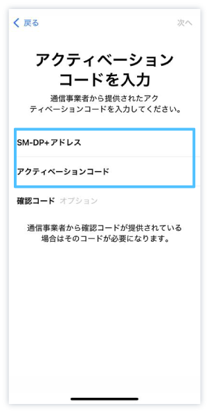 ➡メールに記載されたSM-DP+アドレスとアクティベーションコードを入力
