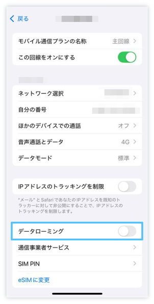 【設定】➡【モバイル通信】➡【主回線】➡【データローミングをオフ】