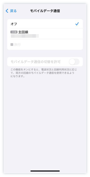 【設定】➡【モバイル通信】➡【モバイルデータ通信】➡主回線の【モバイルデータ通信をオフ】